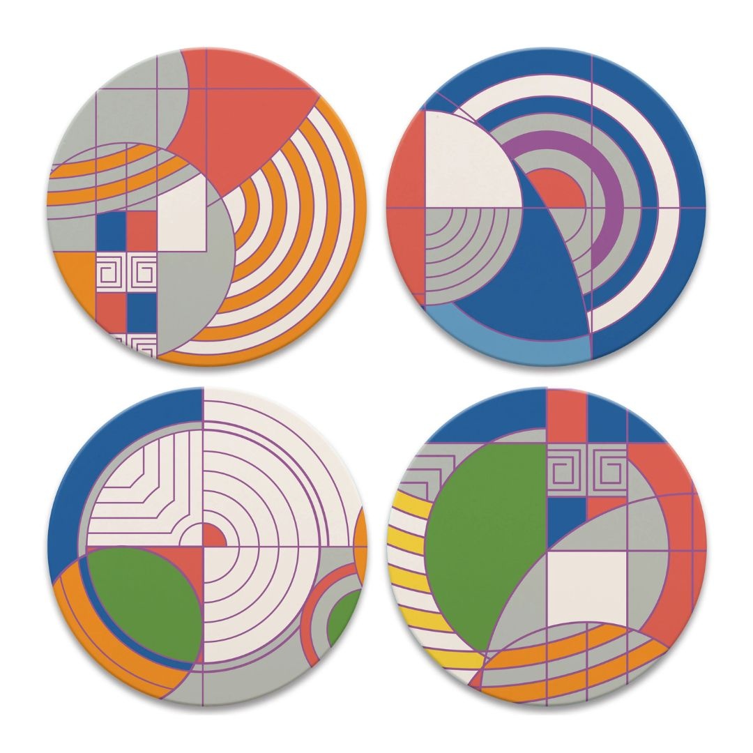 Set of four absorbent sandstone coasters adapted from the bold circular rug pattern rug Wright created for the Max Hoffman residence (Rye, New York, 1955).