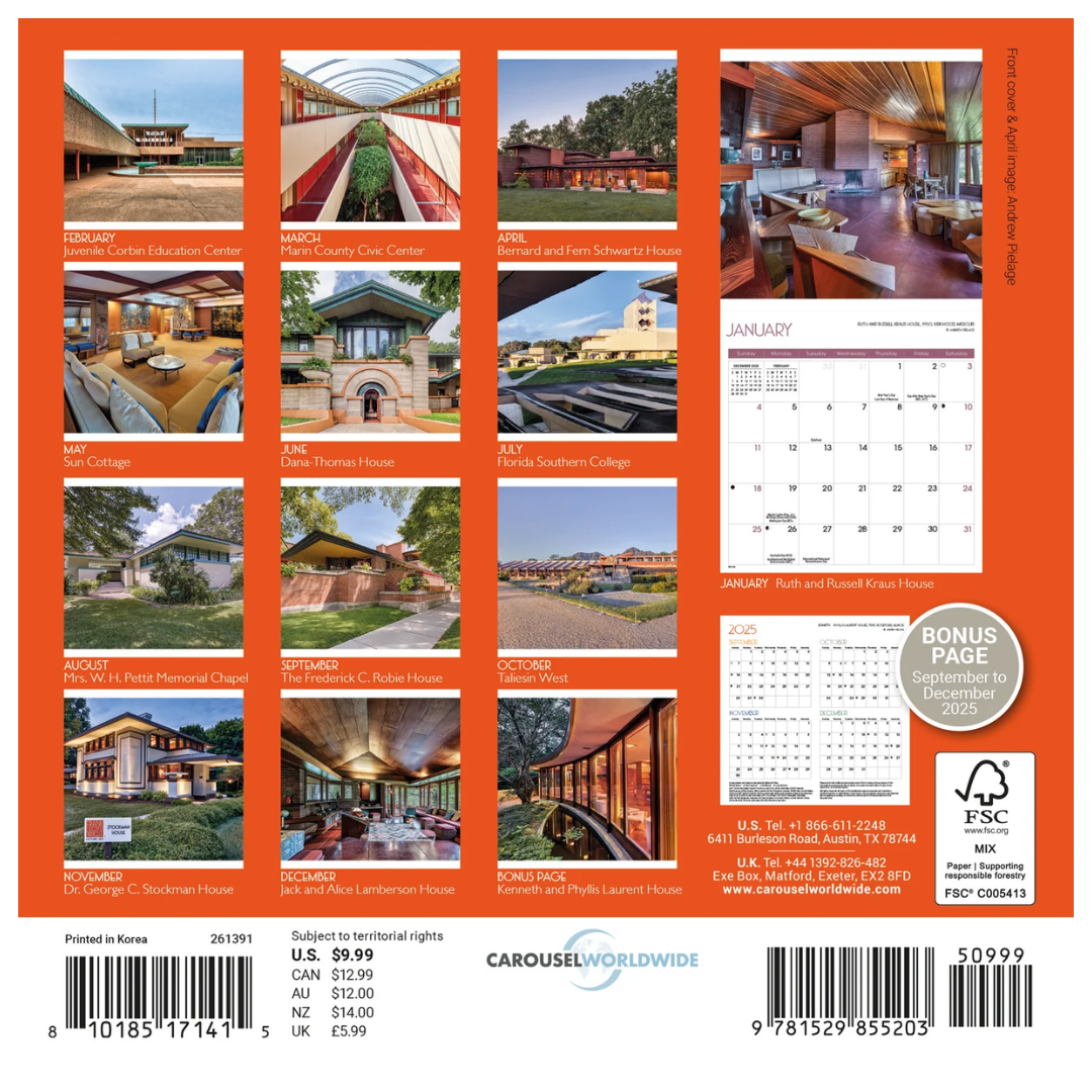 The official Frank Lloyd Wright Photo Mini 2026 Calendar features beautiful full-color photographs of Wright’s visionary and iconic buildings and informative text about each building and Wright’s inspiring design philosophy.