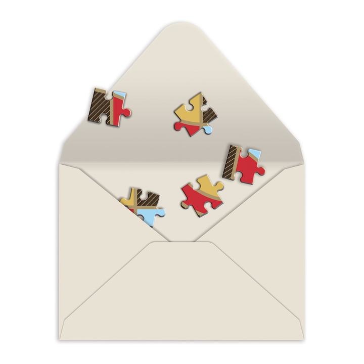 The package comes with the puzzle fully assembled. Write the message on the back, break up the pieces, place in the envelope, and mail.
