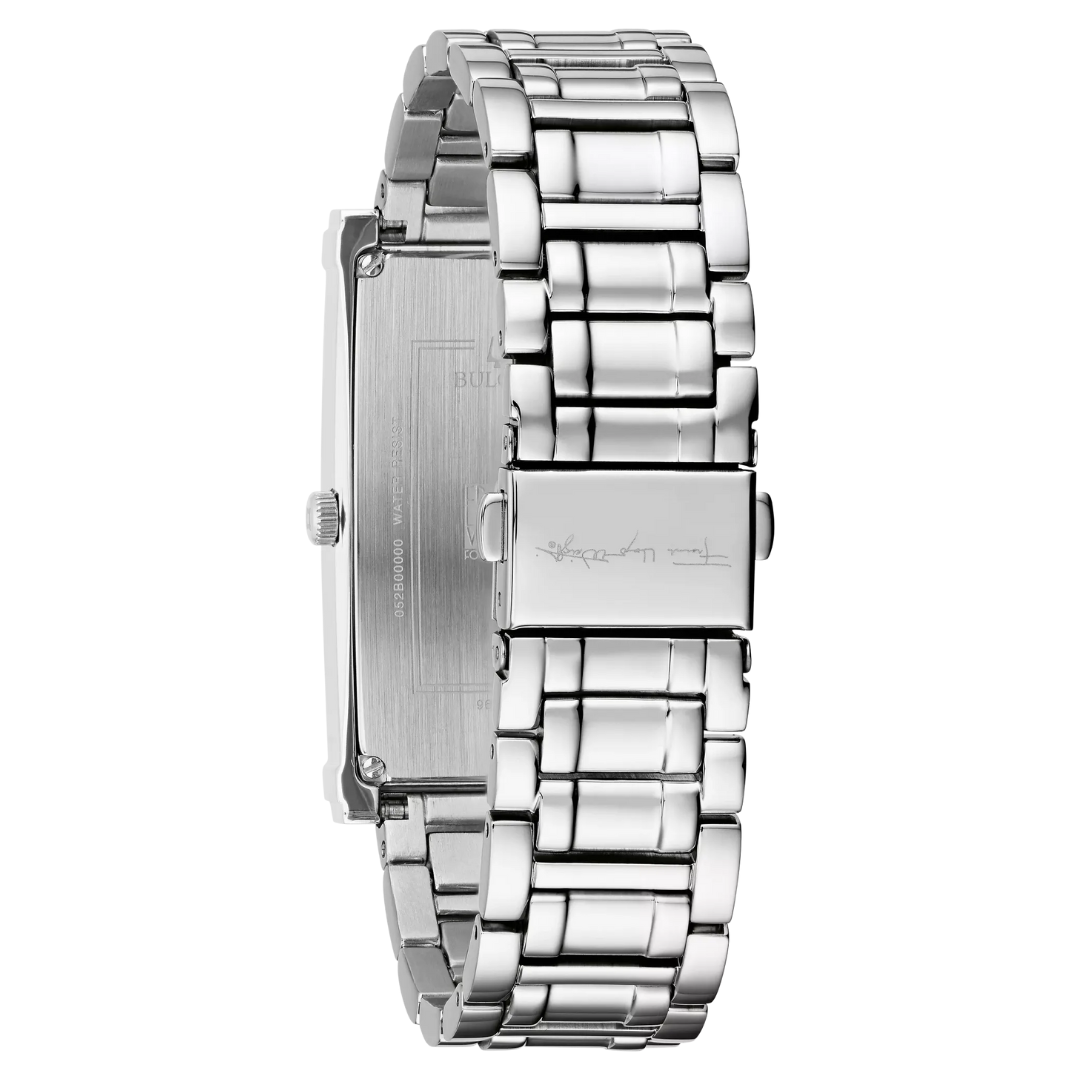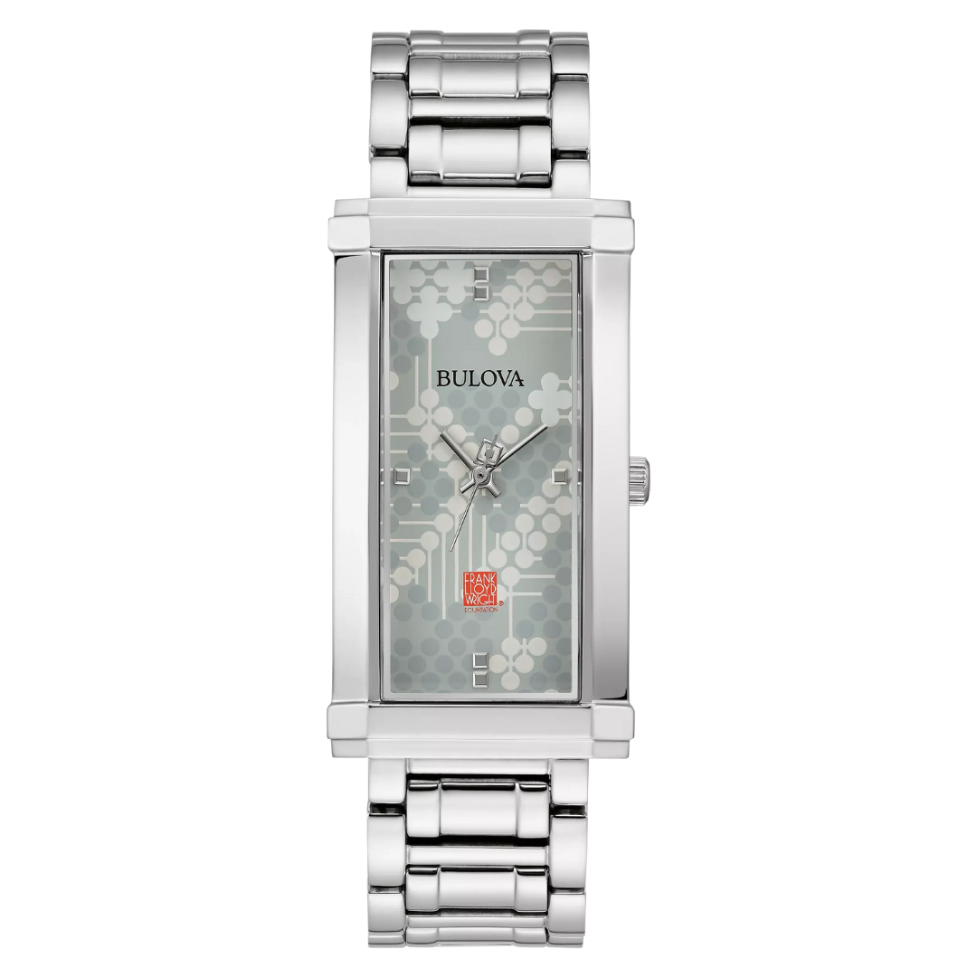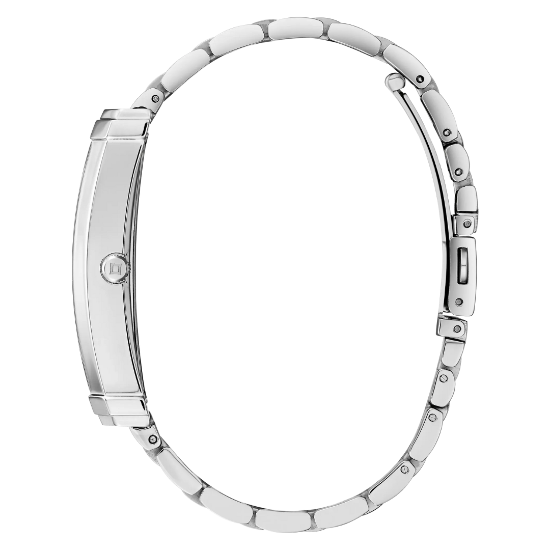 This watch has an elongated stainless steel rectangular curved case. The bracelet, features a complimentary and flexible pattern for elegant wear. The light gray dial features raised hour markers which add dimension to the dial. Watch features a curved mineral crystal, foldover buckle with double press release, and water resistance to 30 meters.